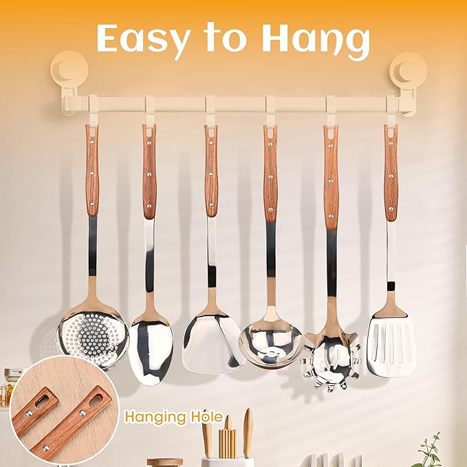 • Easy Cleaning & Space-Saving Storage: All kitchen cooking utensils are dishwasher-safe for quick cleanup and has haning holes, accessible storage—keeping your kitchen tidy while saving drawer space.