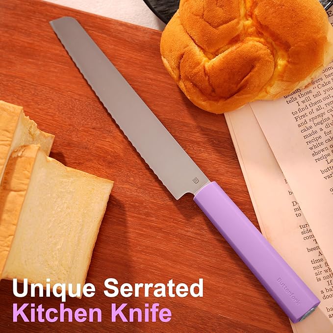 • 【Precise Cutting】- Double-sided irregular wavy blade design effortlessly penetrates hard, crusty bread without crushing or tearing. The professional serrated knife is finely polished to maintain long-lasting sharpness, reduce cutting force, and make meal prep easier.
