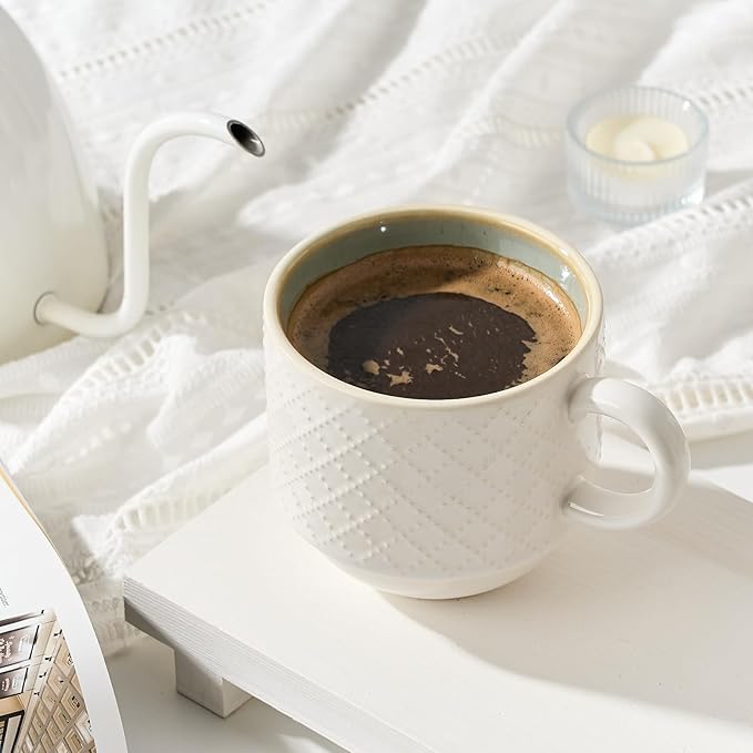 • 【Stunning 4 Different Embossed design】Each coffee mug set has a different emboss-texture and finished in a dots, lines, florets and rhombus grids, and green interior. This coffee mugs set of 4 are designed to be mixed and matched. Artistic shape make an amazing presentation on your table.