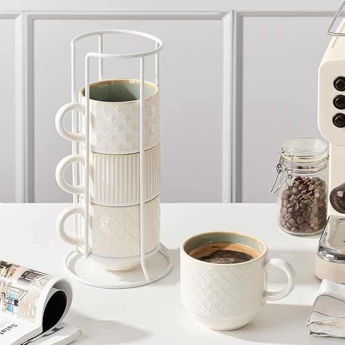 JIEMEI HOME Large Ceramic Coffee Mug Set of 4 with Stand, 15 Oz Stackable Different Embossment Ribbed Latte Cup Set for Cappuccino, Tea, Hot Cocoa, Drinks - Dishwasher & Microwave Safe, White & Green