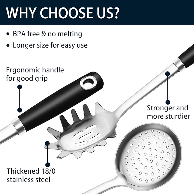 • WHY 18/0 STAINLESS STEEL - Won't melt or break like silicone cooking utensil and won't mold like wooden utensil, a healthier choice that keeps you away from silicone PFAS PFOA PTFE etc,.!