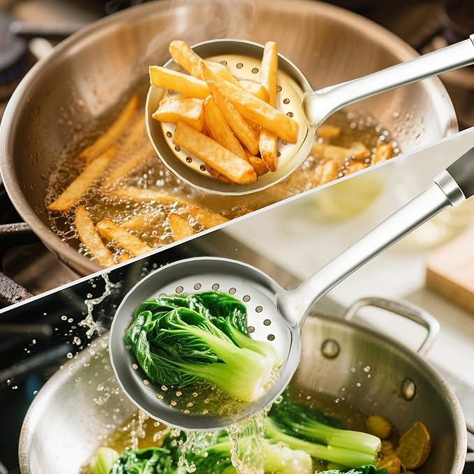 • VERSATILE KITCHEN UTENSILS - Suitable for serving spaghetti, frying, noodles, penne, boiled eggs, fusilli, ravioli, etc. The quick draining feature helps us to easily drain all kinds of food during frying and cooking.