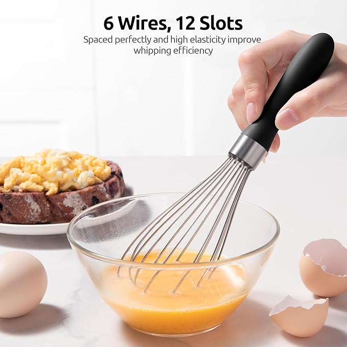 U-Taste 9" Small Egg Whisk: 18/10 Stainless Steel Kitchen Cooking Wire Balloon Wisk, Heavy Duty Metal Beater Stirrer, Manual Baking Tool with 6 Flex Wires for Hand Mixing, Blending Sauce (Black)