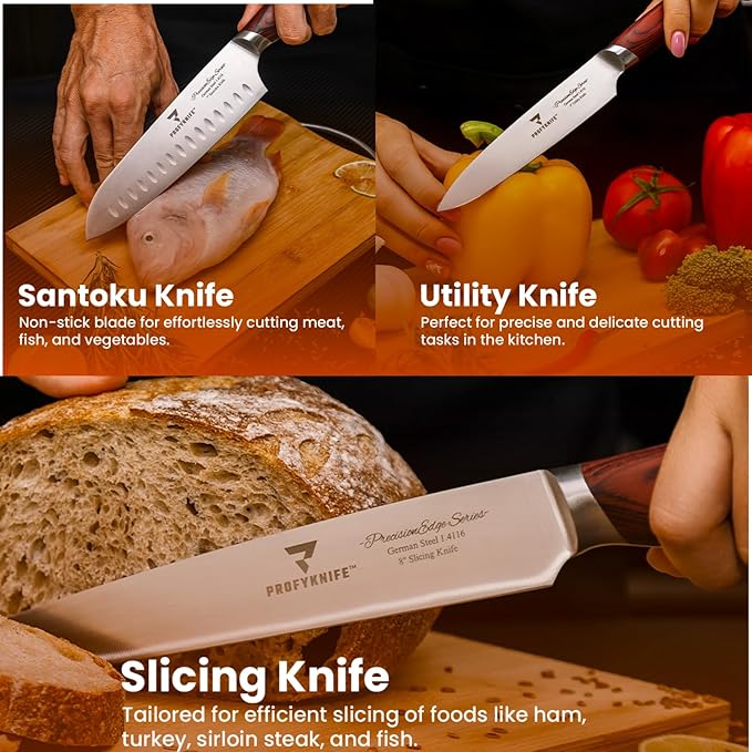 • SOPHISTICATED & WELL-BALANCE - The PrecisionEdge series 3 piece kitchen knife set by PROFYKNIFE stands out with its perfectly balanced handles, making them easy to hold. Featuring luxurious pakkawood handles with a natural texture and reinforced with a single anchor point, these kitchen knife sets are designed for a lifetime of use.
