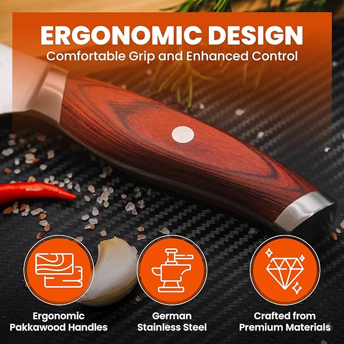 • UNMATCHED SHARPNESS & DURABILITY - Crafted from robust materials, this 3 knife set features a rock-solid design. Scoring 56+ on the Rockwell hardness scale, these BBQ knife set are made from a single piece of rust-resistant 1.4116 German stainless steel, ensuring they withstand any kitchen conditions.