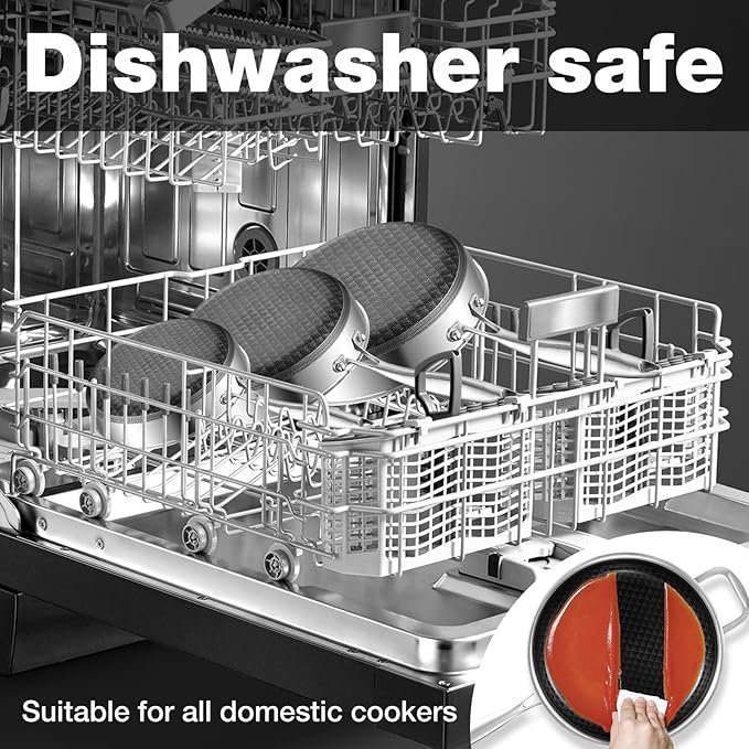 • Full Kitchen Compatibility for Every Cooking Scene:This cooking set works seamlessly with induction cooktops, gas stoves, and ovens, adapting easily to any kitchen environment. Every piece is dishwasher safe, built to endure frequent use, and supports a streamlined, all-in-one cooking experience from prep to cleanup