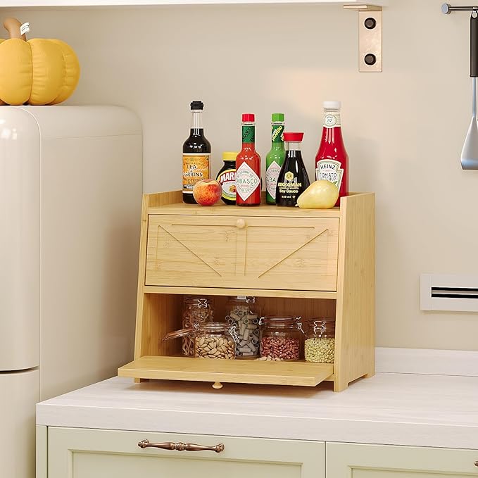 • Large Capacity:Our bread box with 2 layers of 15.8”L x 9.8”W x 13.8”H board are large enough to hold 2 large loaves of bread, rolls, muffins, and more. Flat top design,any kitchen items you want can be placed on the bread box. It can meet the needs of your family