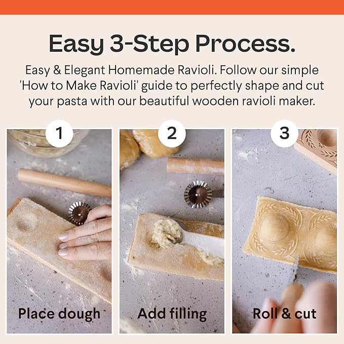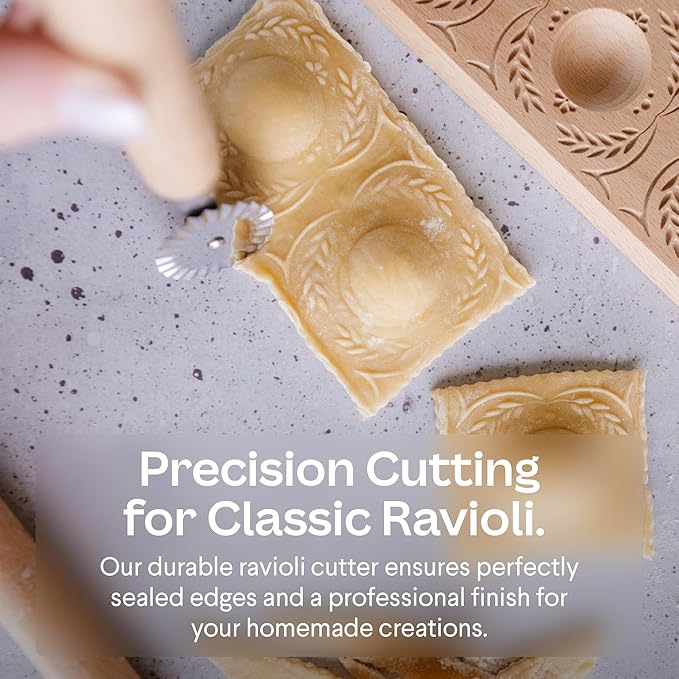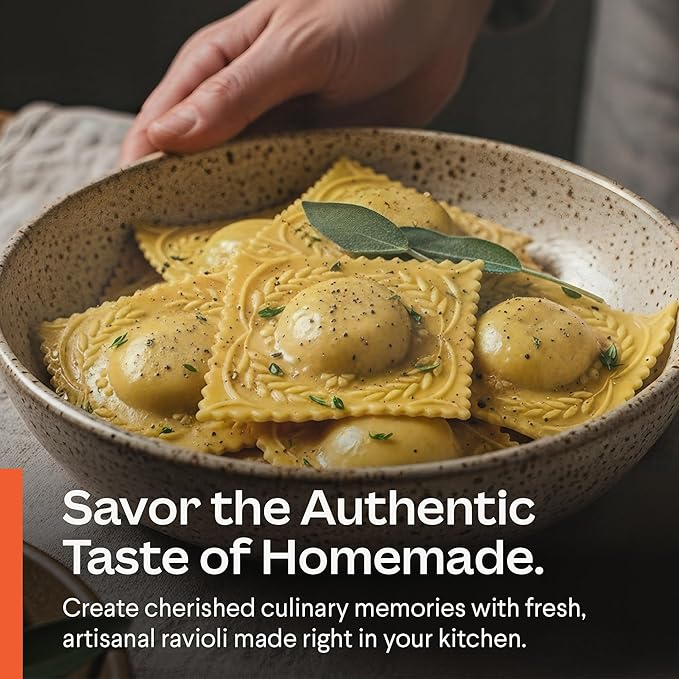 • AUTHENTIC HOMEMADE RAVIOLI MADE EASY - Craft traditional Italian ravioli at home with this artisanal ravioli maker press and mold. Effortlessly create perfectly filled pasta using the included ravioli press, ravioli cutter wheel, and pasta tools - everything you need for delicious homemade pasta.