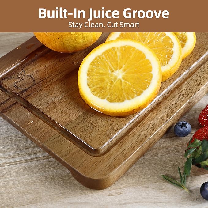 • 【Premium Natural Acacia Wood】Crafted from 100% natural acacia wood, known for its rich grain and lasting durability. Gentle on knives and built to handle daily use, it’s a beautiful, eco-conscious alternative to plastic or glass cutting boards.
