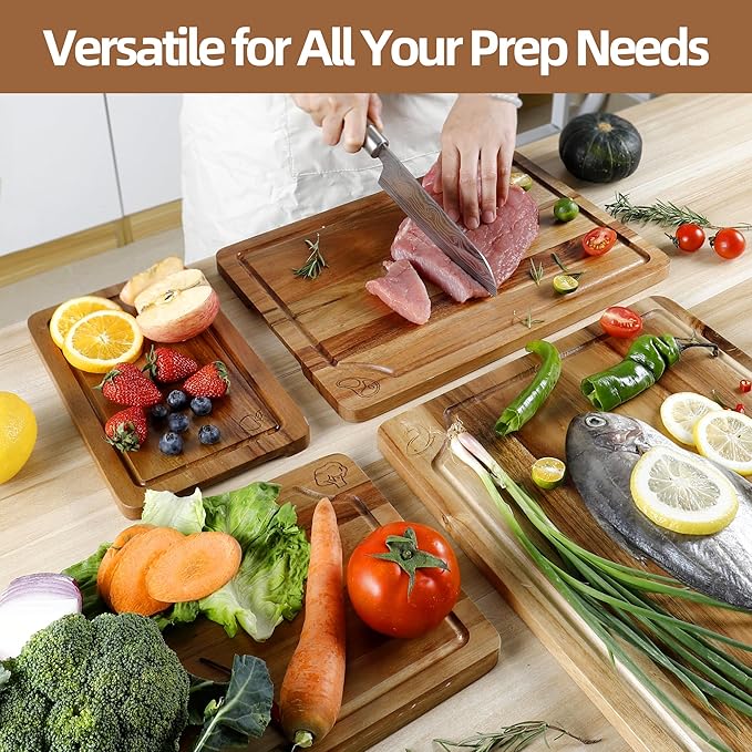 • 【Juice Grooves Keep Counters Clean】All boards feature deep, integrated juice grooves to catch excess liquids from meats, fruits, and vegetables. Keep your workspace clean and mess-free, even during heavy-duty chopping and slicing tasks.