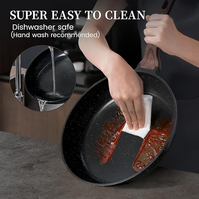 • 【PREMIUM NON-STICK COATING】Cooks with less oil and easily removes from the pan, whether you're pan-frying skin-on fish or scrambling eggs. The advanced non-stick coating makes cleaning a breeze, just wipe or rinse off residue. Ideal for cooking healthy, low-fat meals