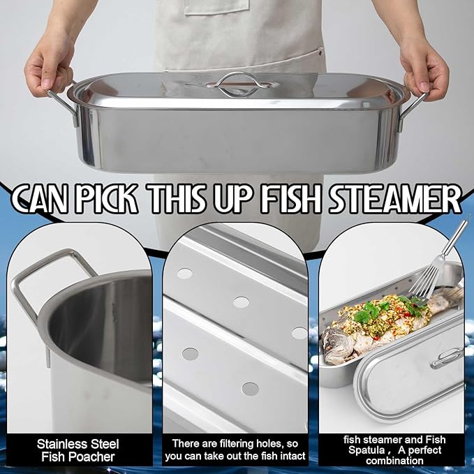 • Optimal Size for Versatile Use: this package includes a fish poacher rack about 20 inches in size and a fish spatula measuring 11.42 x 3 inches, catering to a variety of dishes, including fish and vegetables; The comprehensive dimensions allow you to tackle diverse culinary tasks with ease