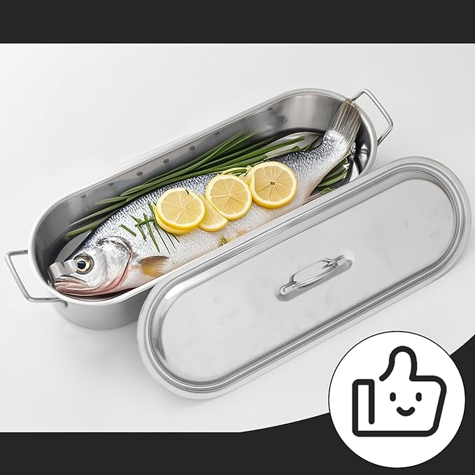 • Space-efficient Design: combining form and function, the fish poacher rack features a classic and compact design that doesn't overcrowd your stove or cabinet space; Its polished appearance enhances kitchen aesthetics, while its size management keeps your cooking area organized