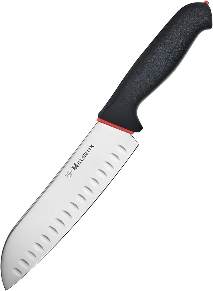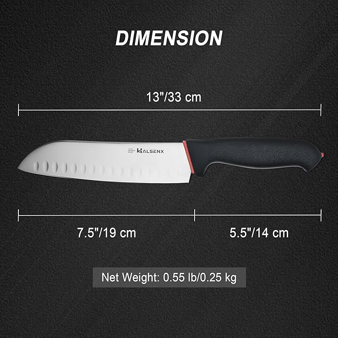 • Our HALSENX 7" Santoku Knife can handle most basic food preparation tasks in the daily kitchen, such as precise dicing, meat peeling and slicing, small-piece chopping, and fruit coring. The combination of a sharp blade and a comfortable handle greatly enhances your cooking experience.