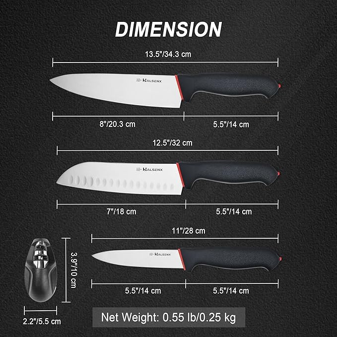 • HALSENX 5 PCS Chef Knife Set incl. 8" chef knife, 7" santoku knife, 5.5" utility knife, In-drawer knife storage mat and knife sharpener. The set is ideal for professional cooking.