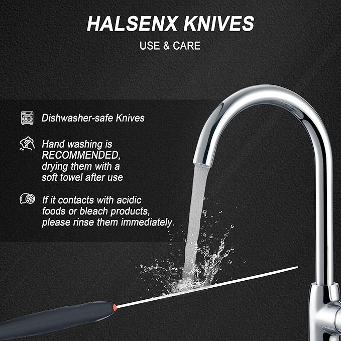 • USE & CARE - Halsenx knives are dishwasher-safe. But to maintain optimal performance, we recommend washing the knives with warm water and drying them with a soft towel after use. Especially when in contact with acidic foods or bleach products, please rinse them immediately.