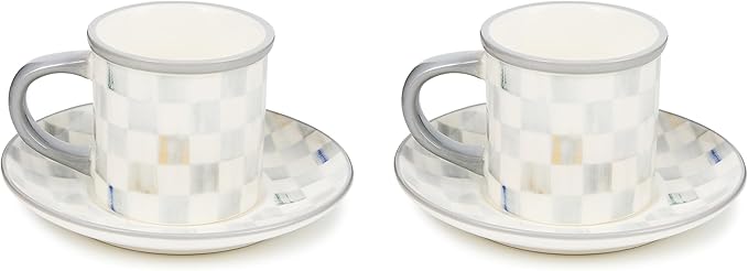 MACKENZIE-CHILDS Set of 2 Stoneware Espresso Cup and Saucer, Cute Coffee Cups, Gray-and-White Sterling Check