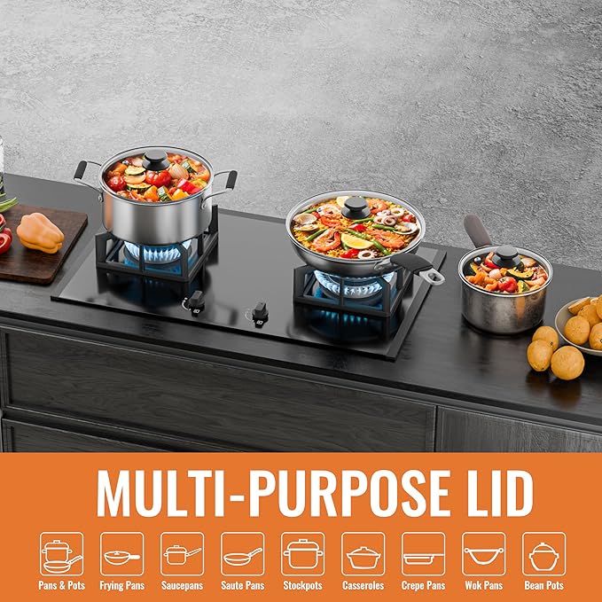 • PREMIUM HD TEMPERED GLASS: With high-definition tempered glass, our durable glass lid for pots and pans ensures even heat distribution and withstands high temperatures. Perfect for pots and pans, it offers a clear view of your cooking without lifting.
