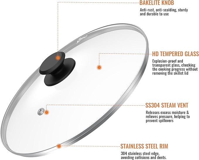 • SS304 STEAM VENT FOR CONTROLLED COOKING: The built-in SS304 steam vent allows excess steam to escape, preventing boil-overs while retaining moisture. A must-have durable glass lid for pots and pans for precise cooking.