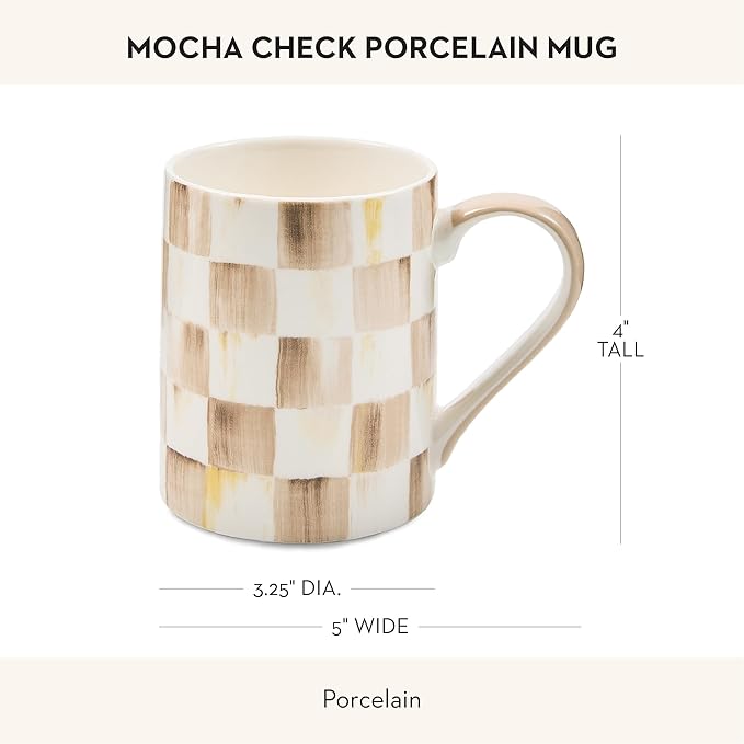 • ELEGANT SERVING ESSENTIAL: Our warm Mocha Check Porcelain Mug is covered in hand-painted brown-and-white checks and comes with a solid-colored brown handle. It has a 3.25-inch diameter and pairs well with your favorite coffee-bar accessories.
