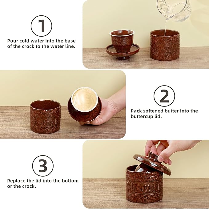 • Easy to Use: No need to use a refrigerator to use the natural water seal; pour cold water from the bottom of the container into the hose; fill the lid of the cup with softened butter; then place the lid back on the base to allow the water to cover the top of the butter to begin preserving