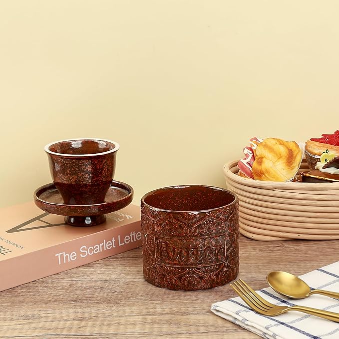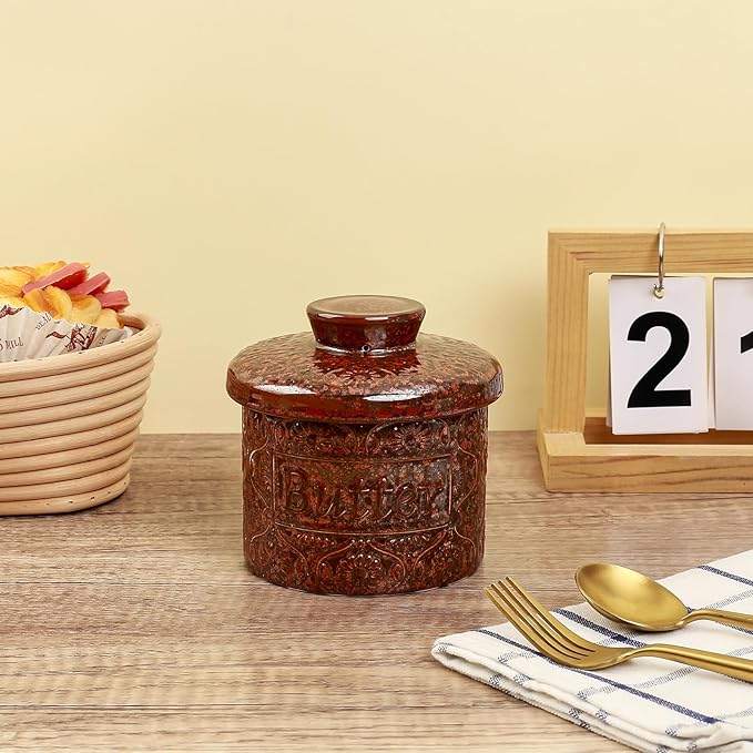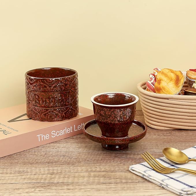 • Suitable Capacity: This butter jar has a capacity of 6.7 oz; can hold one stick of soft butter or your homemade butter; plenty of capacity is perfect for home use; the rustic look also adds a country flavor to your kitchen or dining table