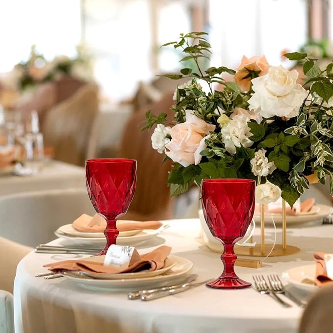 24 Pcs Vintage Wine Glasses, 10 Ounce Colored Glass Water Goblets, Unique Embossed Pattern High Clear Stemmed Glassware Wedding Party Bar Glass Drinking Cups Fancy Wine Glasses Red Set of 24