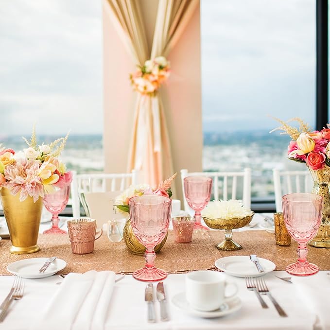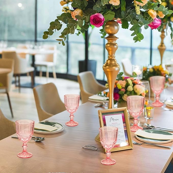24 Pcs Vintage Wine Glasses, 10 Ounces Colored Glass Water Goblets, Unique Embossed Pattern High Clear Stemmed Glassware Wedding Party Bar Glass Drinking Cups, Floral Pink Glasses Set of 24