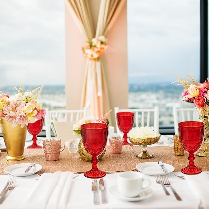 12 Pcs Vintage Wine Glasses, 10 Ounces Colored Glass Water Goblets, Unique Embossed Pattern High Clear Stemmed Glassware Wedding Party Bar Glass Drinking Cups, Floral Red Glasses Set of 12