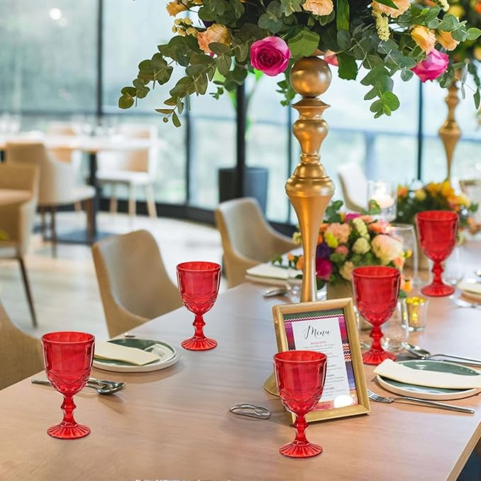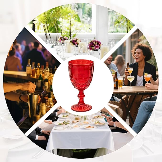 24 Pcs Vintage Wine Glasses, 10 Ounces Colored Glass Water Goblets, Unique Embossed Pattern High Clear Stemmed Glassware Wedding Party Bar Glass Drinking Cups, Floral Red Glasses Set of 24