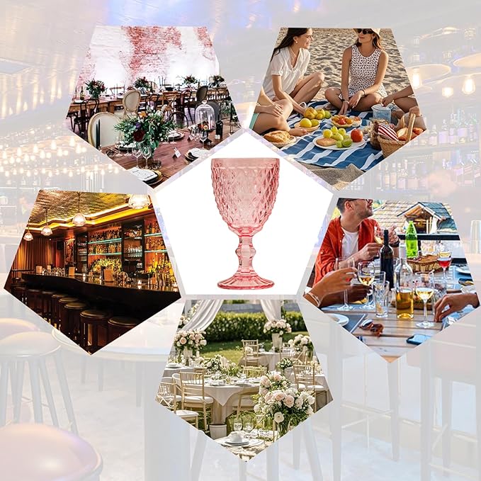 24 Pcs Vintage Wine Glasses, 10 Ounce Colored Glass Water Goblets, Unique Embossed Pattern High Clear Stemmed Glassware Wedding Party Bar Glass Drinking Cups, Diamond Pink Glasses Set of 24