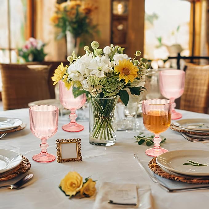24 Pcs Pink Vintage Wine Glasses, 11 Ounces Colored Glass Water Goblets, Unique Embossed Pattern High Clear Stemmed Glassware Wedding Party Bar Glass Drinking Cups Fancy Glasses Set Hand Wash Only