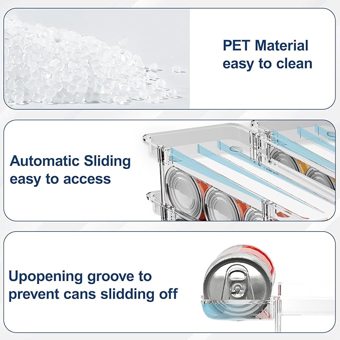 • Lightweight & sturdy: Made of sturdy PET material, this refrigerator soda can organizer is built to last. Non-slip rubber feet ensure it stays firmly in place—no tipping, no shifting, just reliable, hassle-free organize for your beverages. In addition, the product is easier to clean,ensuring your can organizer remains safe and sanitary.