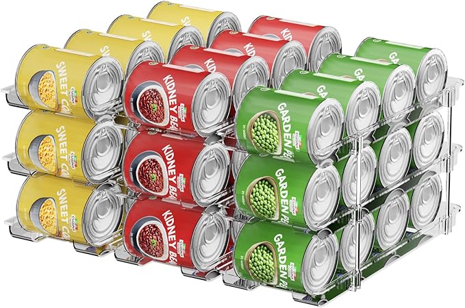 Can Organizer For Pantry,3 Sets 3 Tiers Pantry Organizers And Storage, Pantry Organizer for Fridge 36 Standard and Tall Cans Rack Automatic Rolling Stackable Canned Food Organizer, Clear