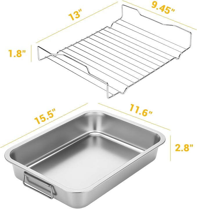 • Versatile - This large roasting pan with rack is perfect for roasting turkeys, hams, prime ribs, chickens, and lambs. This baking pans for oven is also excellent for preparing lasagnas, brownies, casseroles, and vegetables. Ideal for everyday cooking, it’s a great addition to holiday entertaining for occasions such as Easter, Thanksgiving, Christmas, and housewarmings.