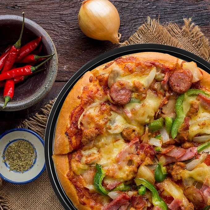 • Built for Baking Glory – Made from 0.4mm thick carbon steel, this round pizza pan is sturdy, reliable, and designed to heat evenly across the surface. Whether you’re baking pizzas or tossing on a batch of cookies, expect consistently delicious results.
