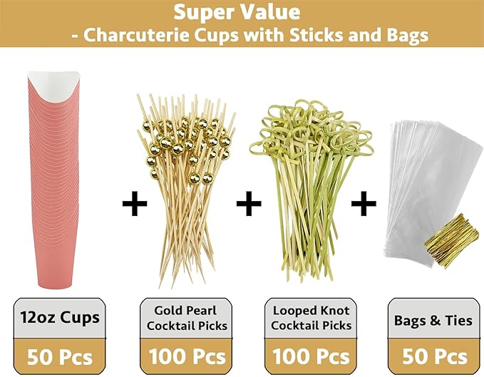 - Included Components : 200 Cocktail Picks, 50 Bags and ties, 50 Charcuterie Cups