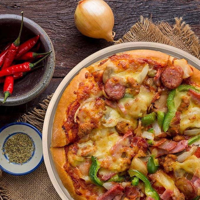 • Built for Baking Glory – Made from 0.4mm thick carbon steel, this round pizza pan is sturdy, reliable, and designed to heat evenly across the surface. Whether you’re baking pizzas or tossing on a batch of cookies, expect consistently delicious results.