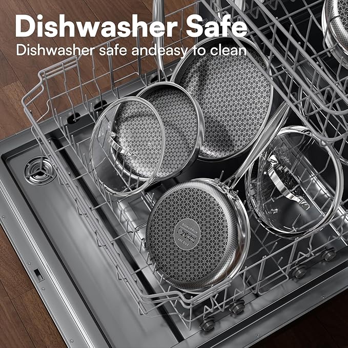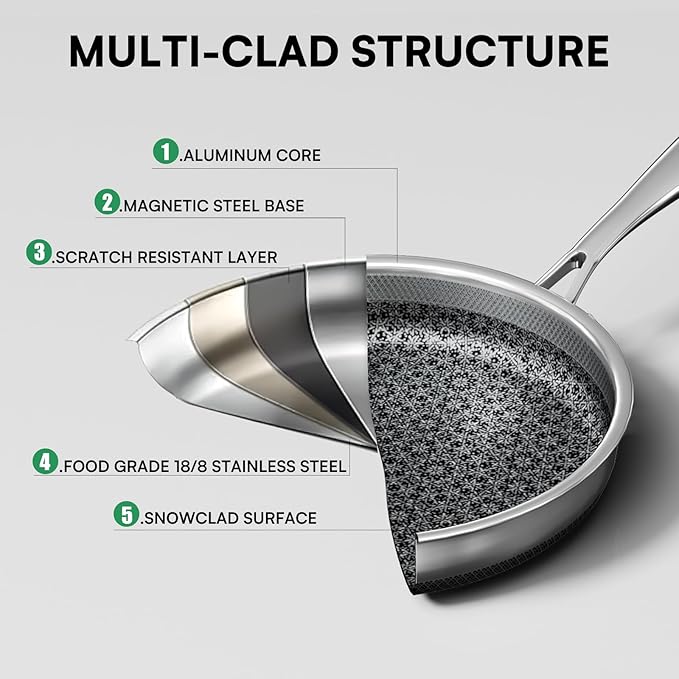 • Superior Durability:KURRUNGIE Nonstick Frying Pans use five construction, with aluminum between stainless steel layers for quick, even heating and easy food release. stainless steel pan The hollow handle stays cool to prevent stovetop overheating.