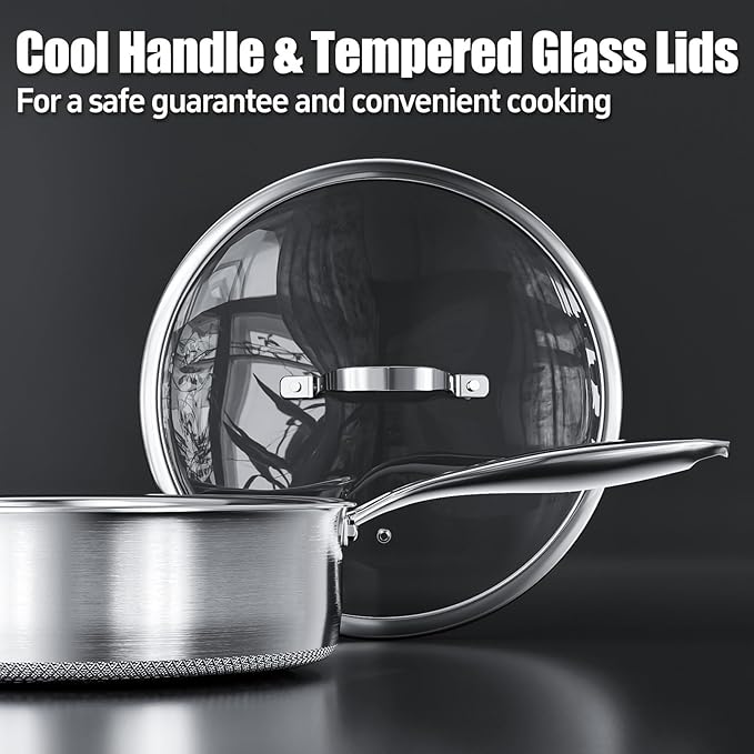 • Special Feature : 5-Layer Stainless Steel, All Stovetops Compatible, Cool Handle, Dishwasher Safe, Tempered Glass Lid