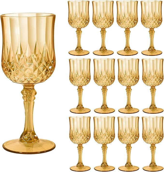 12 Pcs Plastic Amber Wine Drinking Glasses, Plastic Vintage Gold Champagne Vintage Wine Glasses, Unbreakable Goblets for Parties Wedding, Party, Red Wine Glass, Bars, Restaurants, 7Oz