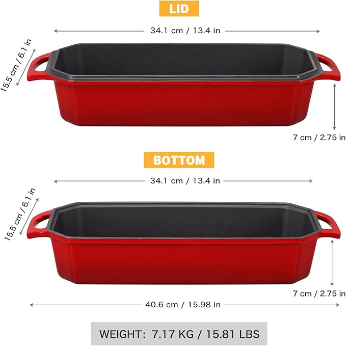 • 13 x 5 inch cast iron loaf pan, suitable for full size loaf bread. You can make two loaves at once, or use the 2nd pan as a lid. Perfect for making homemade sliced bread for sandwiches.