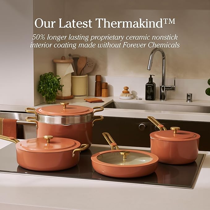 Our Place Essential Cookware Set – 11-Piece Ceramic Nonstick Set with 25cm Frypan, Saucepan, Saute Pan, Stock Pot, Storage Racks and Strainer with Thermakind™ | Oven Safe up to 230°C | Terracotta