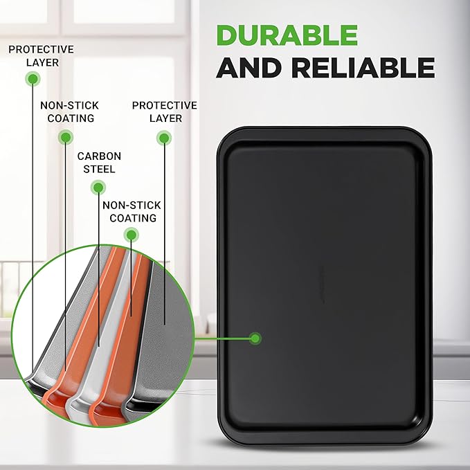 • HEAT-RESISTANT AND DURABLE DESIGN – Built to withstand temperatures up to 446°F, this bakeware ensures safe, even cooking. Reinforced grips provide a secure hold and the carbon steel design prevents warping over time.