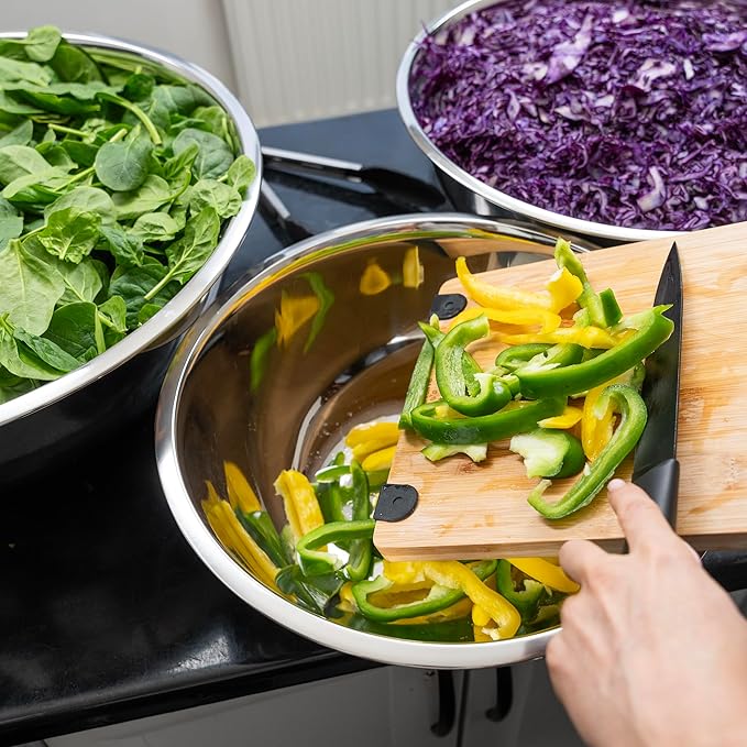• SPACE SAVING DESIGN - Whether it be a restaurant, cafeteria or home kitchen, space is often a scarce commodity. Our gourmet kitchen bowls are designed to be nested so that storing three bowls takes up about the same space as storing one.