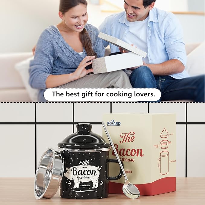 • [Safe Materials] - Both the high temperature resistant enamel grease container, and the removable strainer made of food grade 304 stainless steel prevent corrosion and breakage. and not easily deformed. The spoon can easily scrape away solidified grease and can also be used for spreading and stirring ingredients.