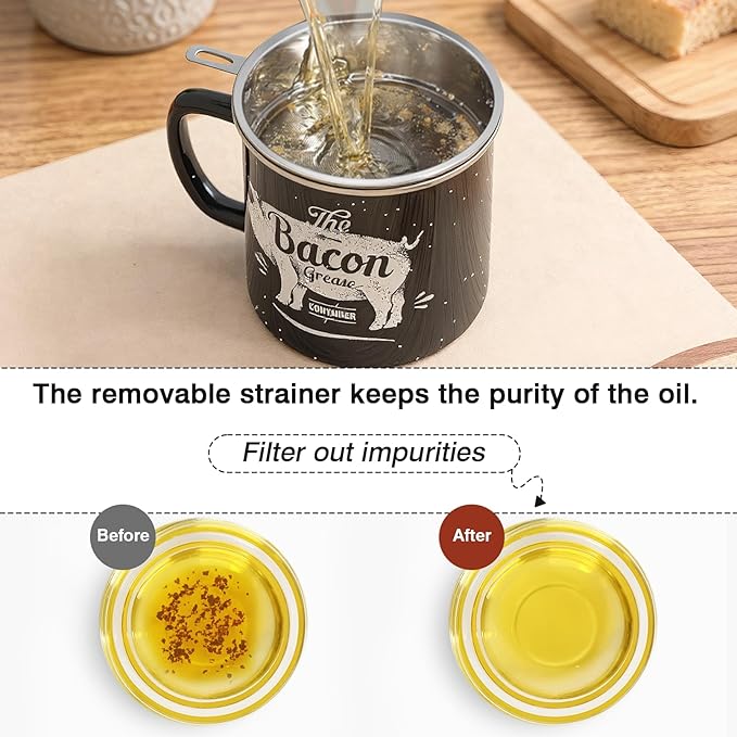 • [Perfect Design] - Our products include bacon grease containers, fine strainers and silicone scrapers, which are perfect for filtering and storing excess oil from the frying process to help reduce oil consumption. And solve the problem of reuse of cooking oil.