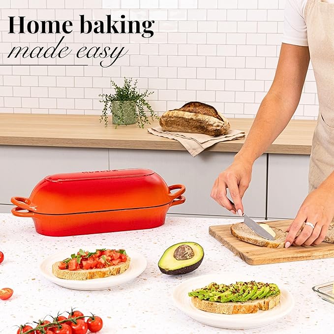 • MOISTURE LOCKING LID: The moisture-locking lid by Nuovva with self-basting ridges captures steam and returns it to your bread or food. Ideal for baking bread, braising meats, and stewing vegetables. The self-basting feature helps keep your baked goods moist and enhances their flavour!