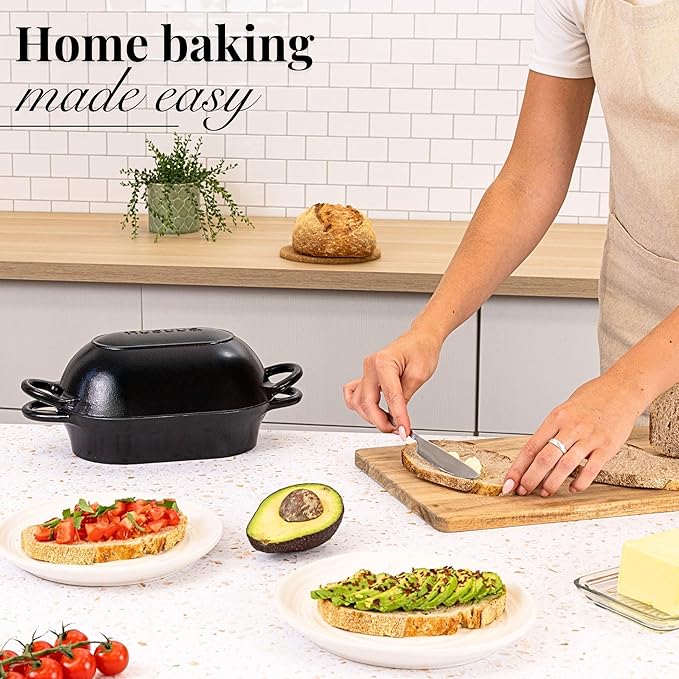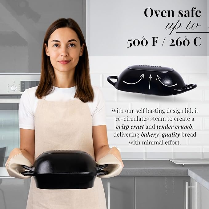 • MOISTURE LOCKING SELF BASTING LID: The moisture-locking lid with self-basting ridges helps retain steam, keeping your bread or other baked goods moist and juicy. Ideal for bread baking, stews, and braised dishes. Enhance the flavour and texture of your food with this unique self-basting feature!