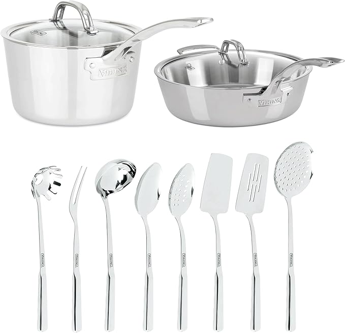 Viking Stainless Steel Kitchen Essentials Bundle – 3-Piece Cookware Set with 8 Cooking Utensils, 4.8 Qt Sauté Pan & Lid, 3.4 Qt Sauce Pan & Lid – Induction Ready, Oven & Dishwasher Safe
